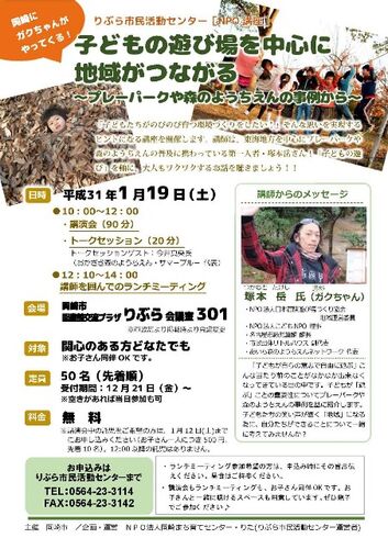 皆様、年末年始は如何お過ごしだったでしょうか!? のーんびり家で過ごした方も 家族で旅行に行ってた方も 1月後半はプラっと講演会に足を伸ばしてみてはどうでしょうか!? まず19日!ようやっと岡崎市が動きだしましたよ皆様(TT) 森のようちえん、プレー…